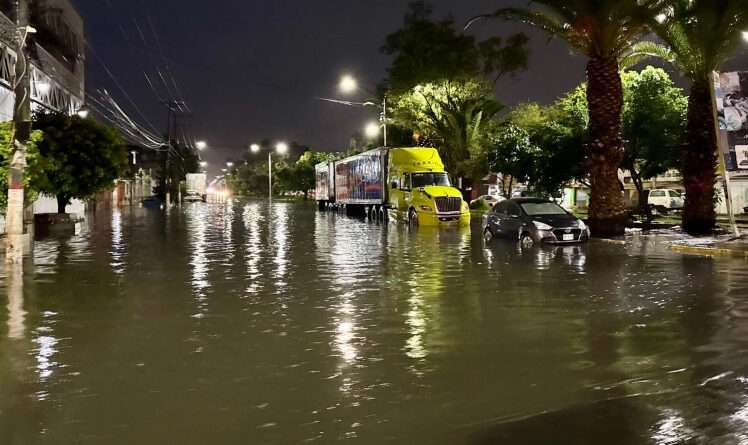 En Nezahualcóyotl, en la llamada zona cero, donde confluyen las avenidas Vicente Villada y Pantitlán, el nivel del agua llegó al límite del nivel de banqueta, lo que obligó al cierre de negocios en este importante crucero.