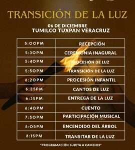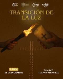 Tuxpan, Ver. 6 /12/2025 Este sábado, en punto de las 17:30 horas se llevará a cabo el evento cultural “Transición de Luz”, en la comunidad Tumilco. Se realizarán ceremonias ancestrales, procesiones, participaciones artísticas y la iluminación de los 4 caminos o rumbos, para dar paso a la luz de vida.