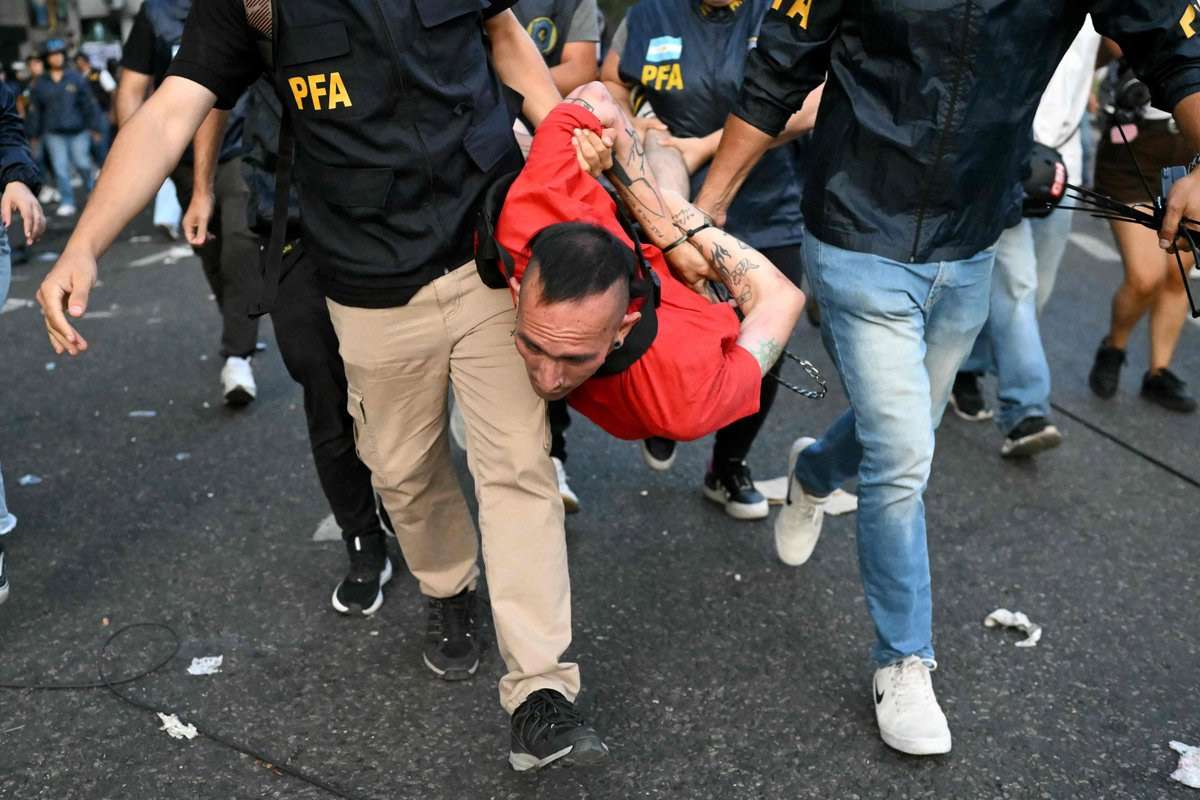 Policías federales, y de la ciudad de Buenos Aires, gendarmes y prefectos se apostaron en las calles adyacentes y por momentos daban la impresión de que se libraba una guerra. Las columnas se dispersaron, y aparecieron las motocicletas para cazar personas a distancia de los hechos violentos, y hay una cifra de unos 15 detenidos, pero ninguno de ellos pertenece al grupo de provocadores.